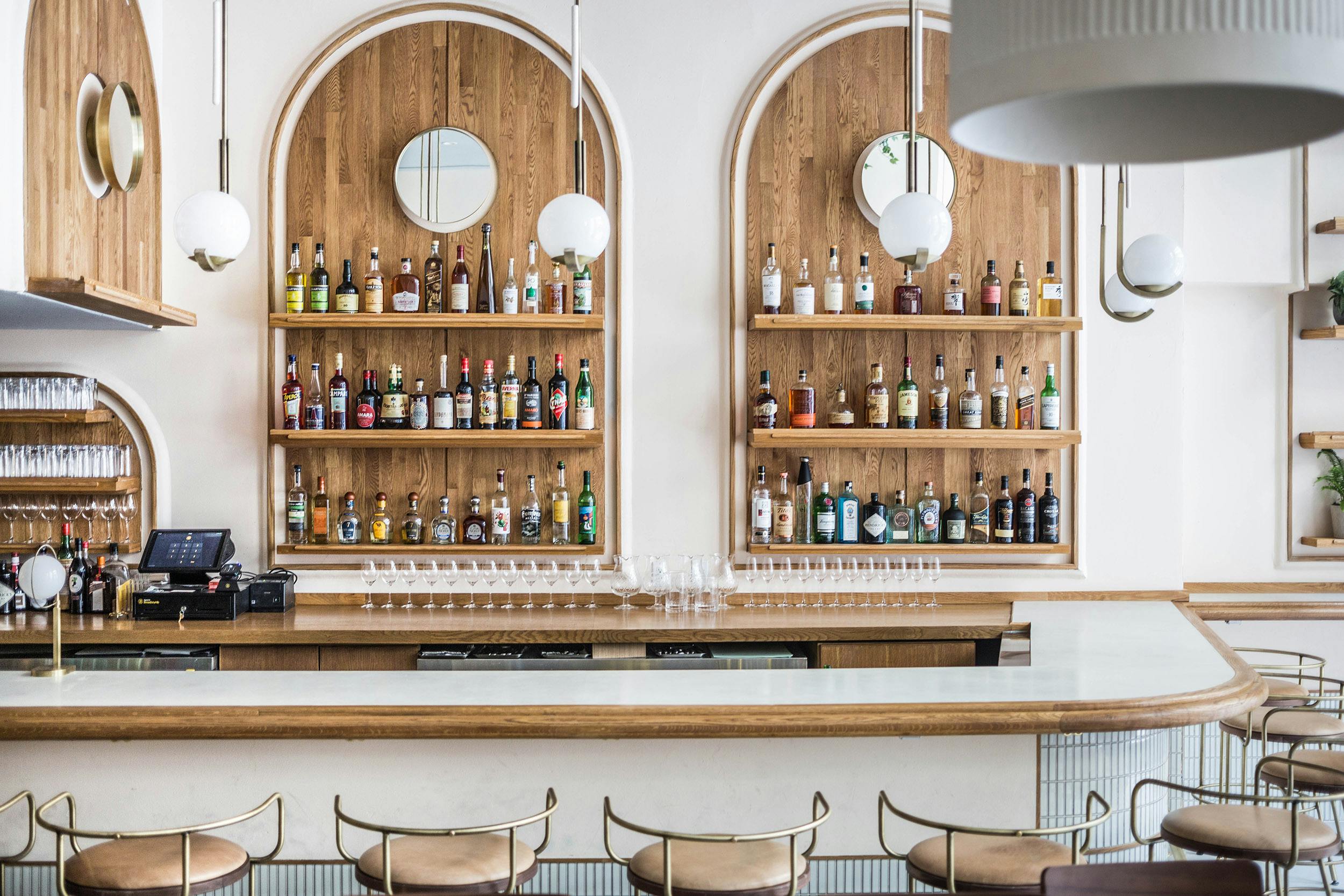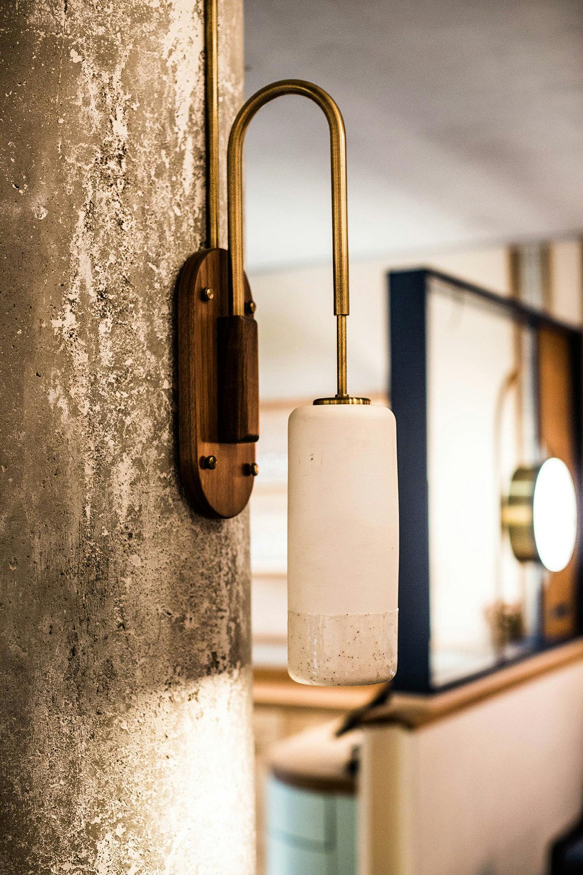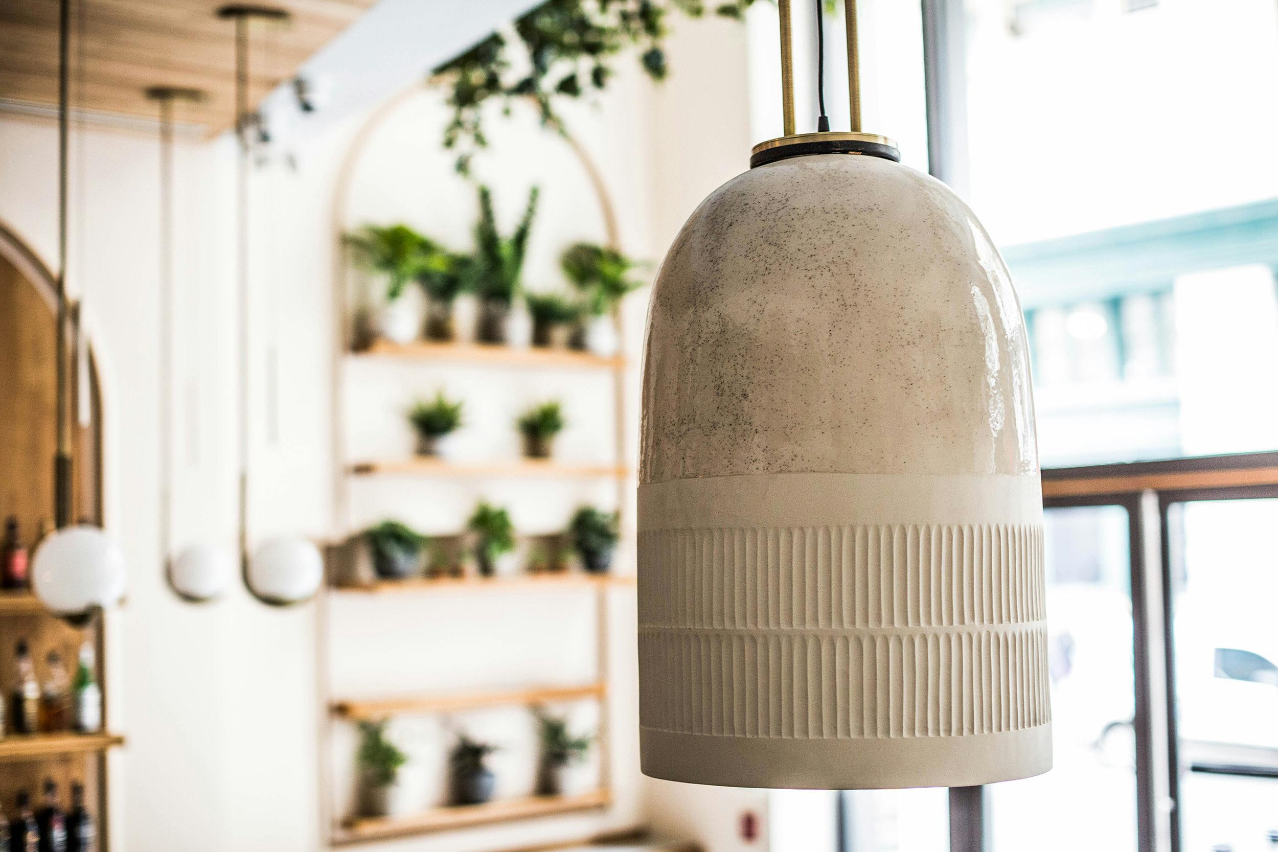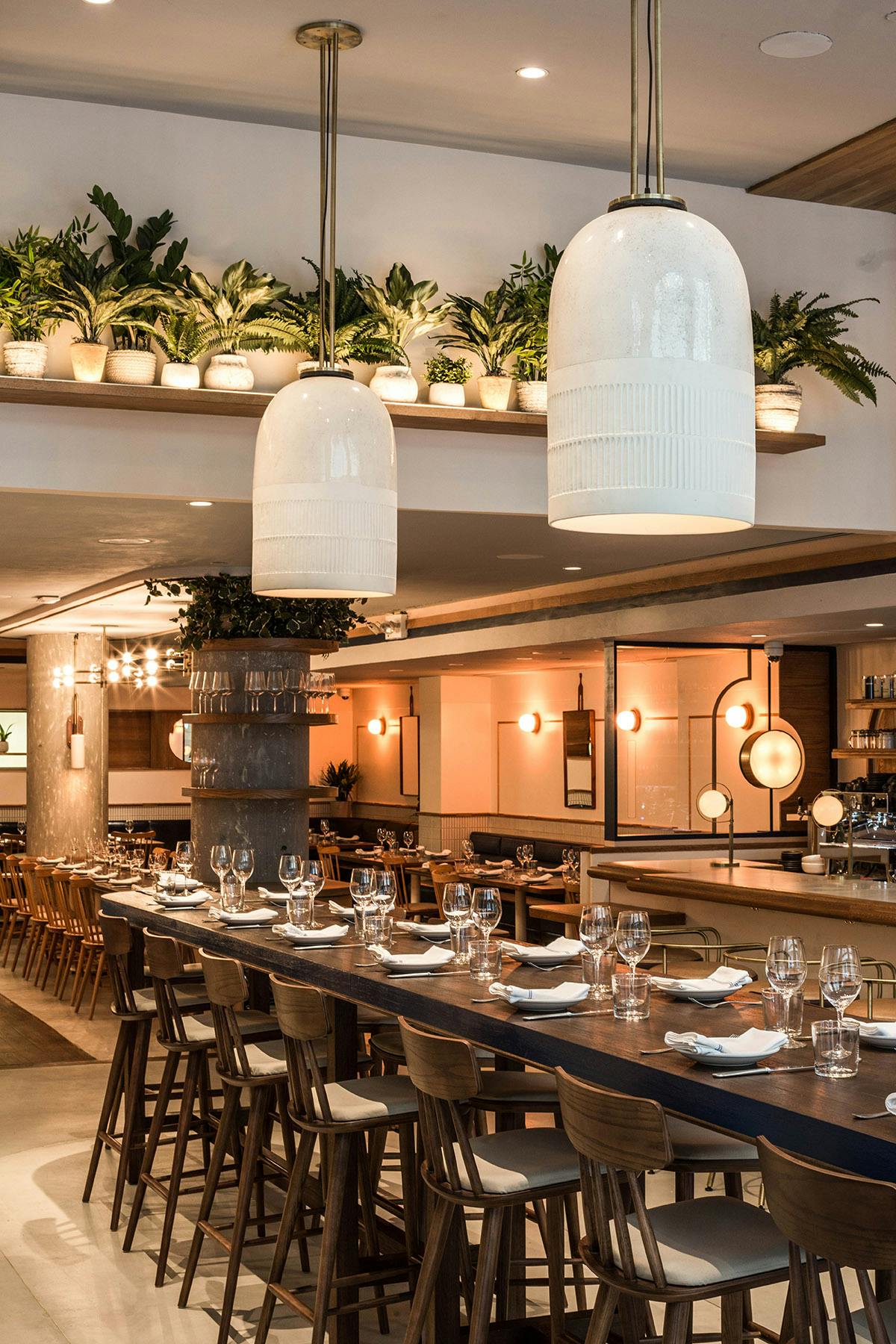 "Fusing Mediterranean seaside with postmodern Italian design, the custom-crafted space boasts rich neutral tones of white oak, hand blown rose-colored wall sconces, and geometric hanging pendants in brushed brass and white porcelain."