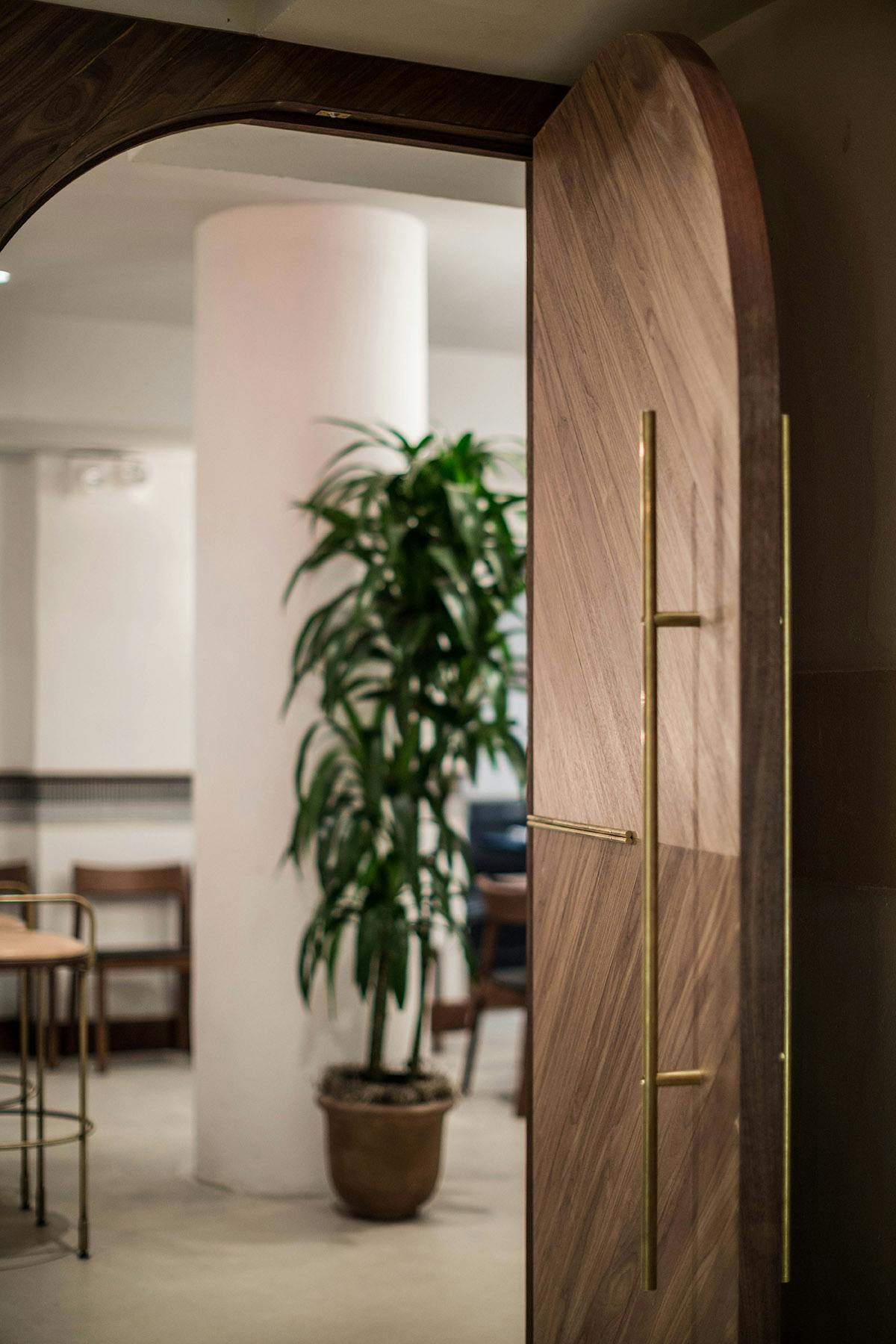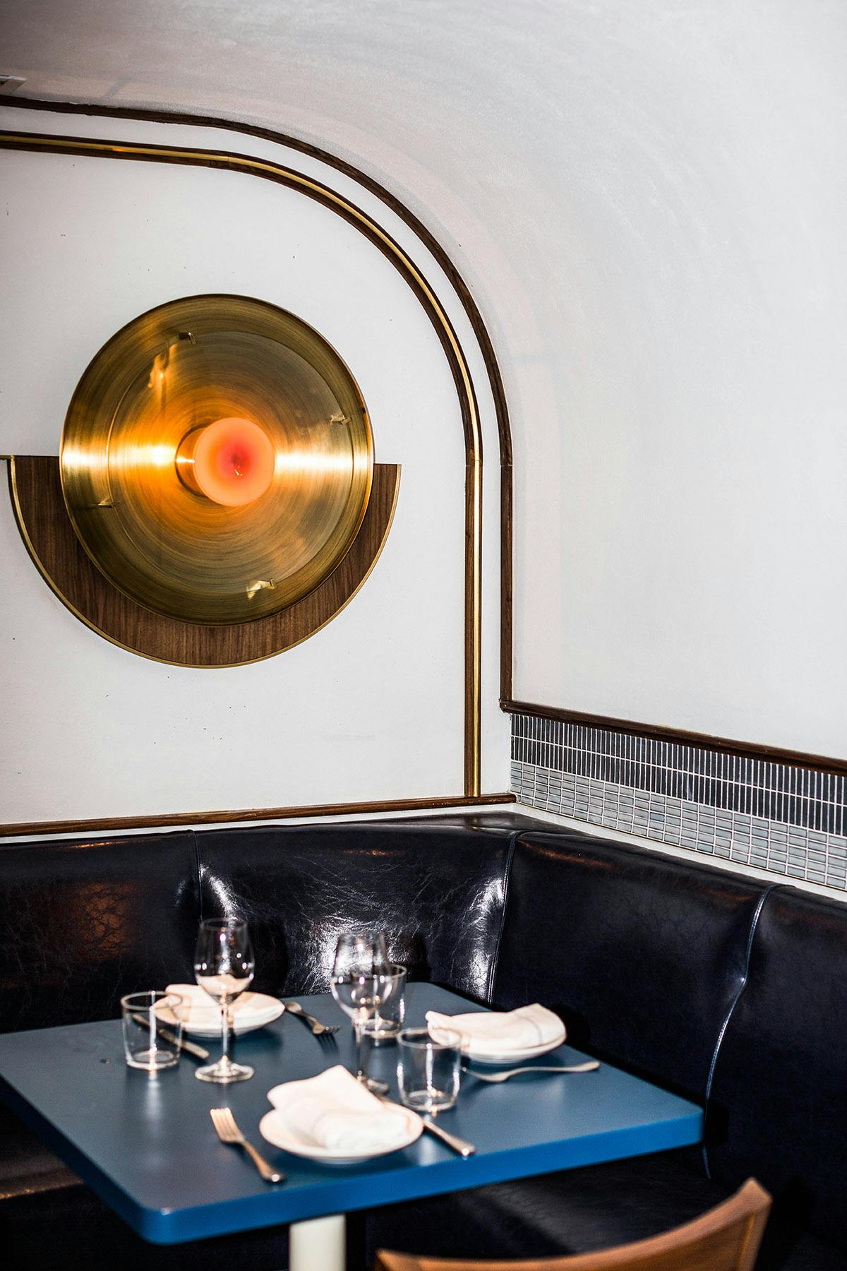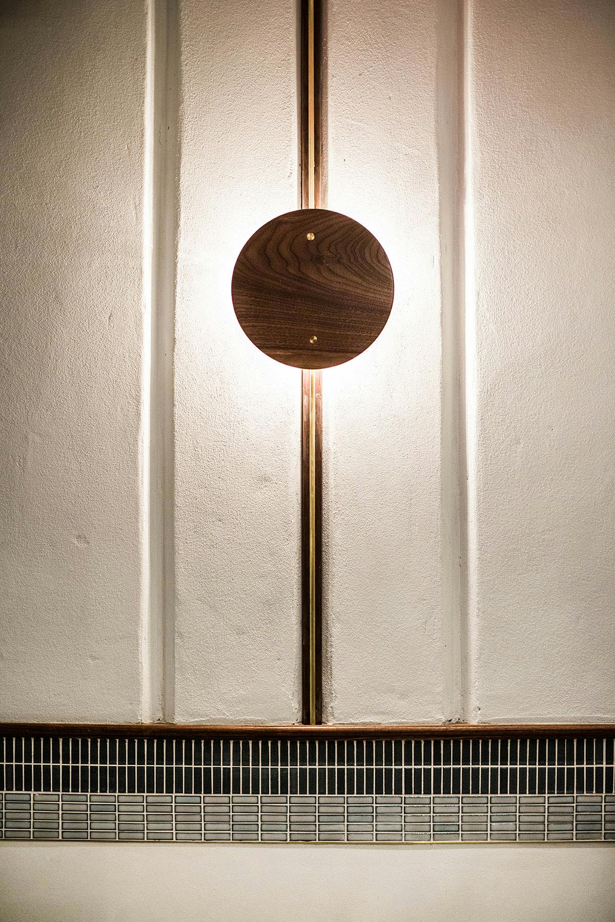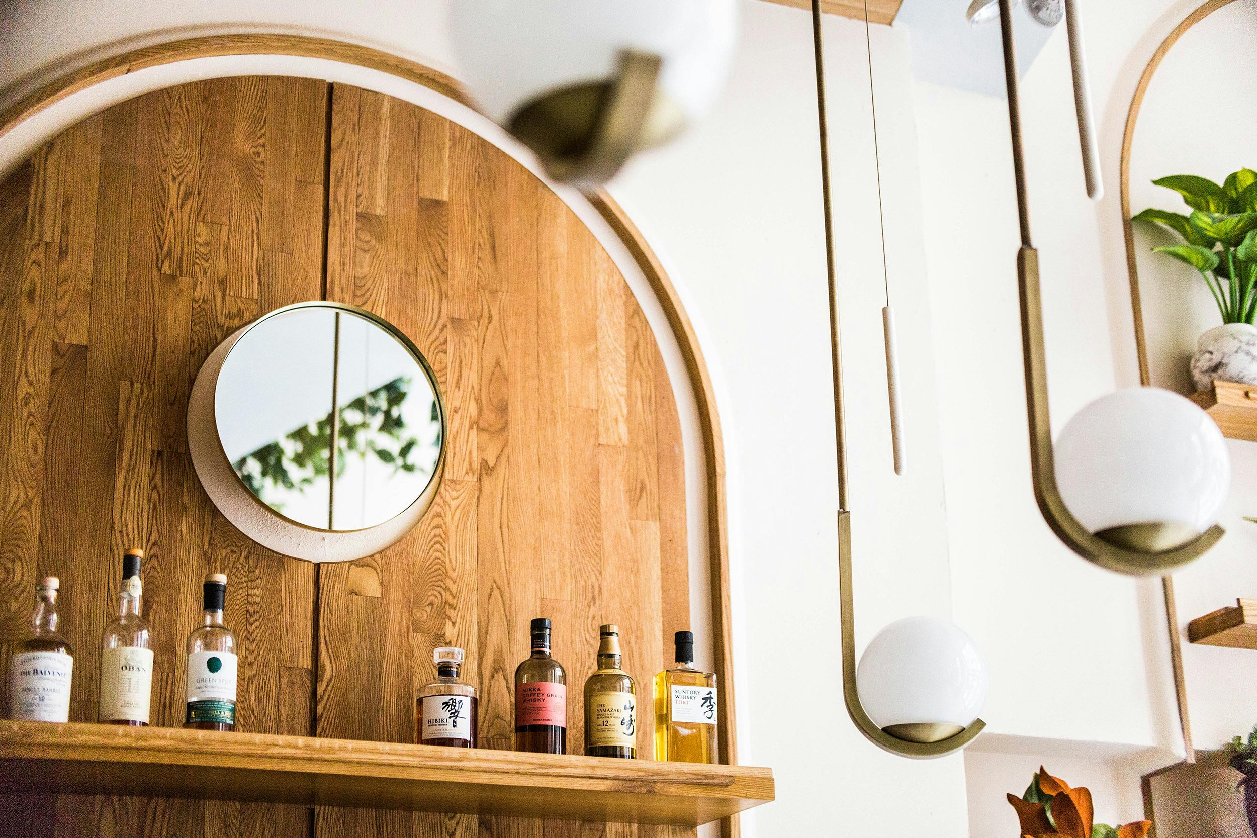 "Fusing Mediterranean seaside with postmodern Italian design, the custom-crafted space boasts rich neutral tones of white oak, hand blown rose-colored wall sconces, and geometric hanging pendants in brushed brass and white porcelain."